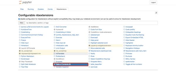 conda install -c conda-forge jupyter_contrib_nbextensions执行上述命令后,启动Jupyter Notebook,你会发现导航栏多了“Nbextensions”的类目,点击“Nbextensions”,勾选“Table of Contents”