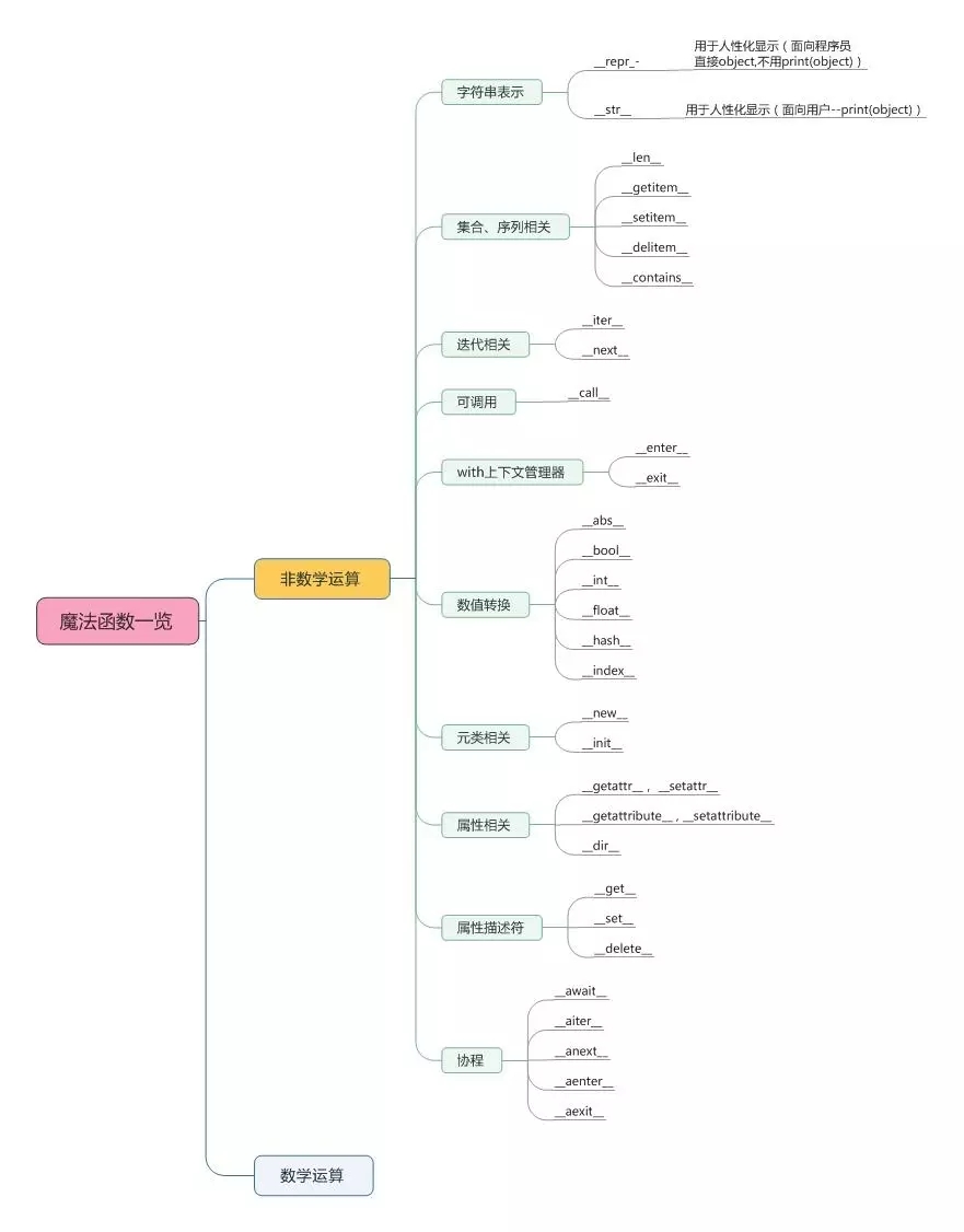 python的魔法函数总被双下划线包围,它们可以给你的类增加特殊的方法。如果你的对象实现了这些方法中的一个,那么这个方法就会在特殊情况下被调用,你可以定义想要的行为,而这一切都是自动发生的。